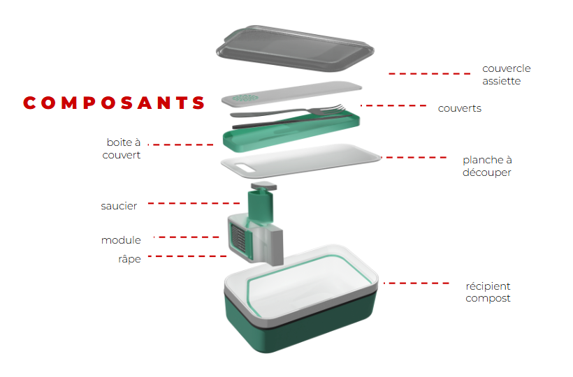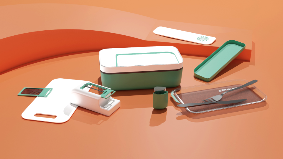 Proposer aux travailleurs une réappropriation de leur repas du midi en proposant un Tupperware capable de contenir des ustensiles que l’on ne retrouve normalement que chez soi.